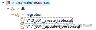 特别说明:通常情况下,迁移脚本的格式为 V<VERSION>__<NAME>.sql(其中 <VERSION> 为下划线分隔的版本,如 "1 "或 "2_1";<NAME>一般你可以写上该脚本的描述信息)。还有一点要注意:<VERSION>与<NAME>中间是两个下划线:__,最终目录如下: