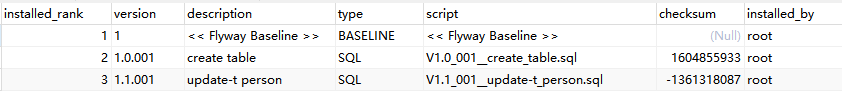 执行了升级脚本,创建了数据库。查看flyway_schema_history表数据:
