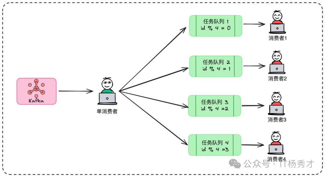 这种方式,通过一种哈希策略,例如 queueIndex = orderId.hashCode() % 4 (假设有4个工作线程),确保了同一订单的消息会被投递到同一个任务队列,并由同一个工作线程来顺序处理,从而在消费端内部保证了局部顺序性。