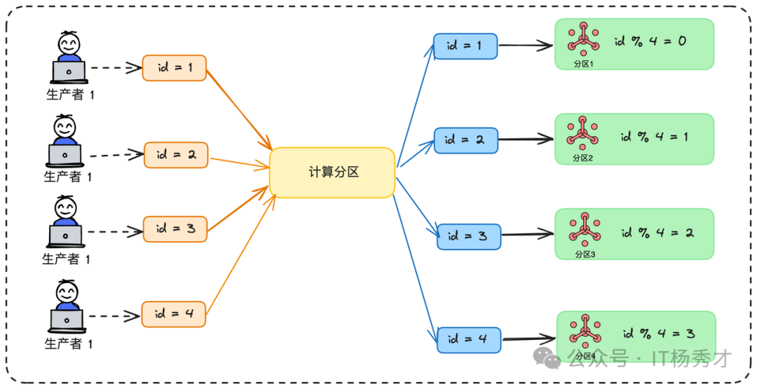 增加了系统复杂性:你需要自己管理内存队列、线程池、线程安全以及优雅停机等问题,使得消费端的逻辑变得复杂,容易出错。存在数据丢失风险:消息从Kafka取出,成功提交Offset,然后放入任务队列后,如果此时消费者进程意外崩溃,那么内存中尚未被工作线程处理的消息就会永久丢失。更重要的是,它丝毫没有解决生产者端和Broker端的单点写入压力问题。既然我们已经有了“按业务ID哈希分发”的思想,为什么不更进一步,直接利用消息队列自身成熟、可靠的分区机制,来实现一个更原生的方案呢?