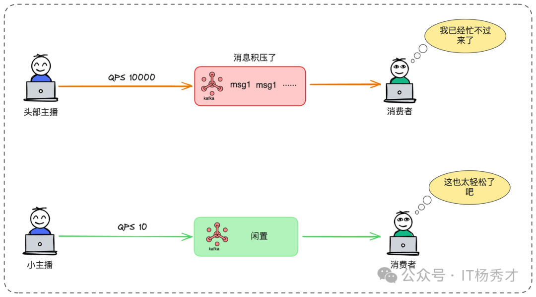 想象一个营销活动场景,某头部主播正在直播带货,几百万用户同时涌入,产生了大量的订单。如果我们的分区键是activityId,那么这场活动相关的所有消息都会涌入同一个分区,造成这个分区“热点”,消息严重积压;而其他分区则可能门可罗雀,资源闲置。