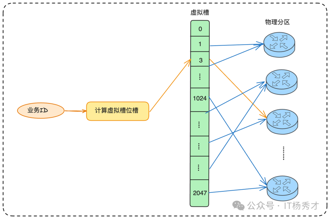 受启发于一致性hash环,其实是增大了取模分母。同样我们可以引入一个中间层——虚拟槽。不再将业务键直接映射到物理分区,而是先映射到一个固定数量的虚拟槽上(例如Redis的16384个,但是一般情况下我们业务不会用到这么多的槽位,比如在业务中可以简化为2048个,整个数量其实已经足够多了)。