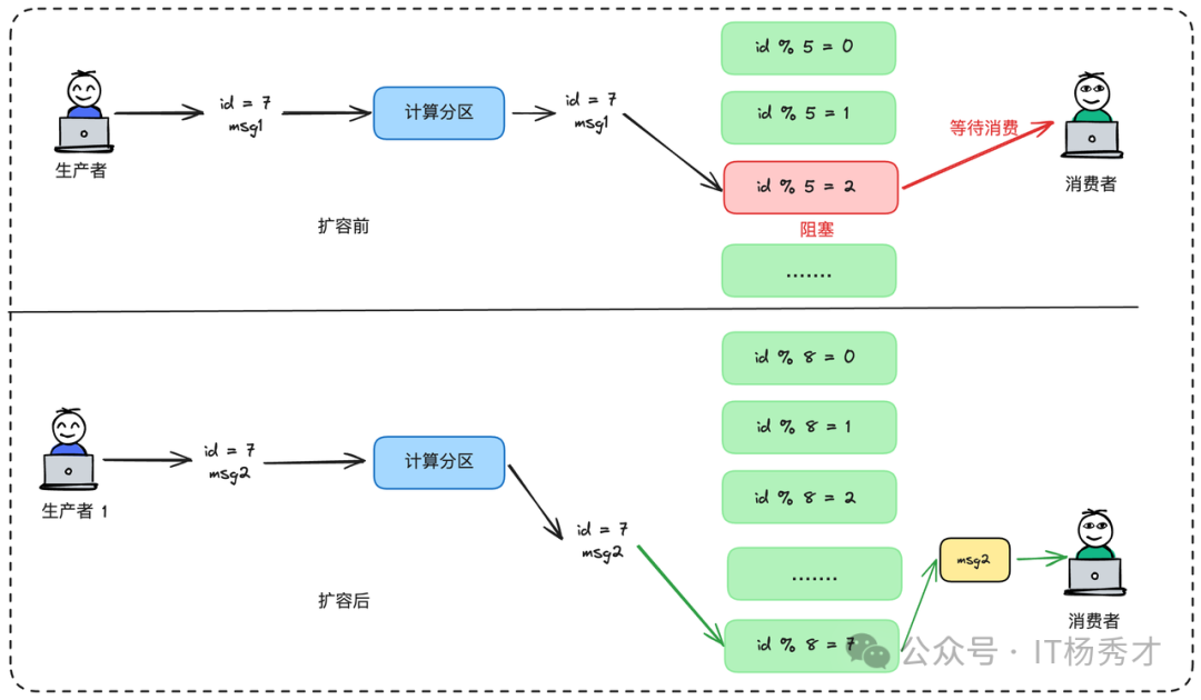 时间点T1:分区数为5,订单SN20250823XYZ的消息M1(已创建)根据hash("SN20250823XYZ") % 5被发送到了分区2。但此时分区2有些积压,Msg1正在排队等待消费。时间点T2:我们完成了扩容,分区数变为8。时间点T3:订单SN20250823XYZ的后续消息M2(已付款)到来,根据hash("SN20250823XYZ") % 8被发送到了分区7。分区7是新增的,非常空闲,消费者立刻就取到了Msg2并完成了处理。最终的结果是,“已付款”事件先于“已创建”事件被处理,业务逻辑发生严重错乱!