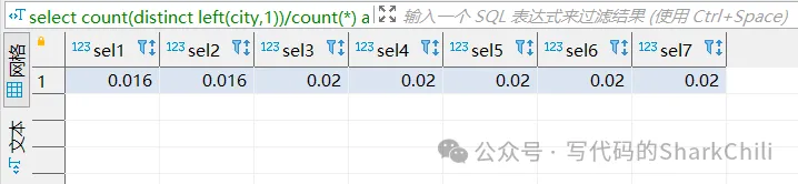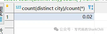 输出结果如下,说明完全不重复的city仅仅占用2%,所以我们创建的前缀索引的基数要尽可能接近这个值,才能做到数据区分最大化: