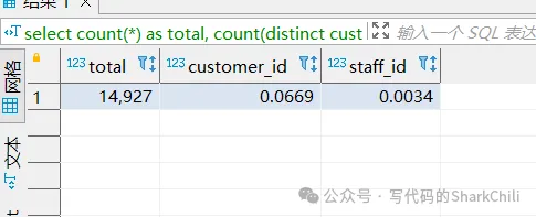 因为我们的查询sql需要用到customer_id和staff_id作为查询条件,所以我们希望为这两列字段创建组合索引,所以我们使用了如下sql语句获取这两列的基数。