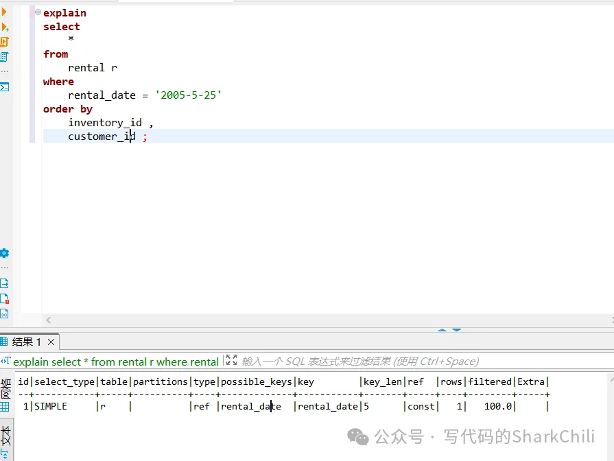 1|PRIMARY |rental| |range|rental_date,idx_fk_inventory_id|idx_fk_inventory_id|3 | |16215| 100.0|Using where; Using index|