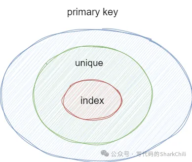 实际上主键、unique、index的关系如下图所示,由于开发对于三者关系的不了解,导致了创建了两个没有必要的索引,所以我们日常还是需要多留心一下这些问题: