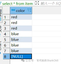 对于count我们也可以用于某列的归类操作,例如我们希望查询出颜色为蓝色或者红色的行的数量。我们的数据如下所示,可以看到颜色为3红4蓝1空。