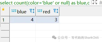 select count(color=blue or null) as blue,count(color=red or null) as red from item;1.