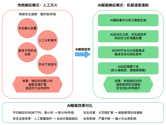 AI赋能自动响应使企业实现安全事件的机器速度遏制,将分析与行动之间的鸿沟弥合,显著缩短平均响应时间(MTTR)从数小时到数分钟甚至秒级。这能最大限度地限制攻击的扩散和危害,在威胁萌芽阶段就予以遏制,从而大幅减少攻击造成的损失和业务中断。同时,它将安全团队从繁重、重复的响应操作中解放出来,提升整体安全运营效率。