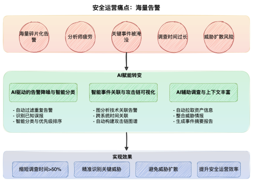 安全运营中心(SOC)在安全事件发生时,常被海量、碎片化、低价值告警淹没,人工分析师需要花费大量时间进行去重、分类、关联和上下文补充,才能判断事件的真实性和危害。这种海量告警导致分析师疲劳,关键事件被淹没,平均调查时间(MTTI)过长,错失最佳响应时机,导致威胁容易扩散并造成更大的损失。