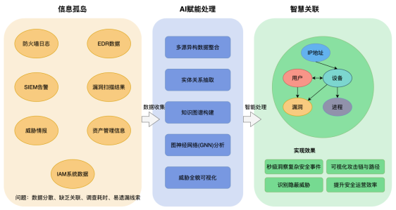 企业的网络安全运营面临海量且高度碎片化的安全数据。这些数据来源于不同的安全设备(如防火墙、EDR、SIEM、漏洞扫描工具、威胁情报平台以及资产管理系统)。由于缺乏有效的关联和统一的视图,安全分析师在调查复杂安全事件时,必须耗费大量时间从不同系统中手动收集、整理和关联信息,不仅效率低下,而且极易出错或遗漏关键线索。这种信息孤岛现象导致分析师难以快速理解事件的深层逻辑、攻击者的真实意图以及威胁的演变路径,从而阻碍了高效的威胁溯源和决策。