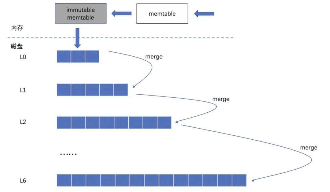 从 L1 层开始,每往下一层空间都会比上一层大很多,通常是 10 倍左右。如果第 i 层的数据总大小超过第 i 层阈值限制了,会自动挑选一个文件和第 i+1 的文件合并,这里就和 LSM 树理论一致了。合并完成之后,除了 L0 层,其他每层的数据都是有顺序的,并且层与层之间也是有顺序的,也就是数据完全有序。