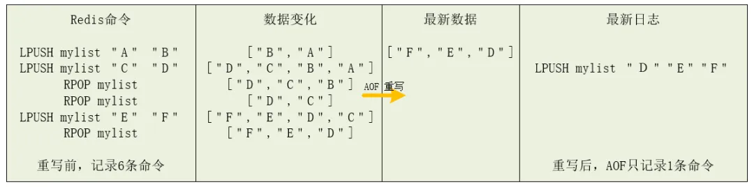 这样,当需要恢复时,可以重新执行该命令,实现 “testkey”: “value” 的写入,而并不关心中间对这个 key 的其他写操作。以下图为例,当我们对一个列表先后做了 6 次修改操作后,列表的最后状态是 [“D”, “E”, “F”],此时,只用 LPUSH mylist “D”, “E”, "F" 这一条命令就能实现该数据的恢复,这就节省了五条命令的空间。这样对于被频繁修改过的键值对来说,重写能节省大量的空间。
