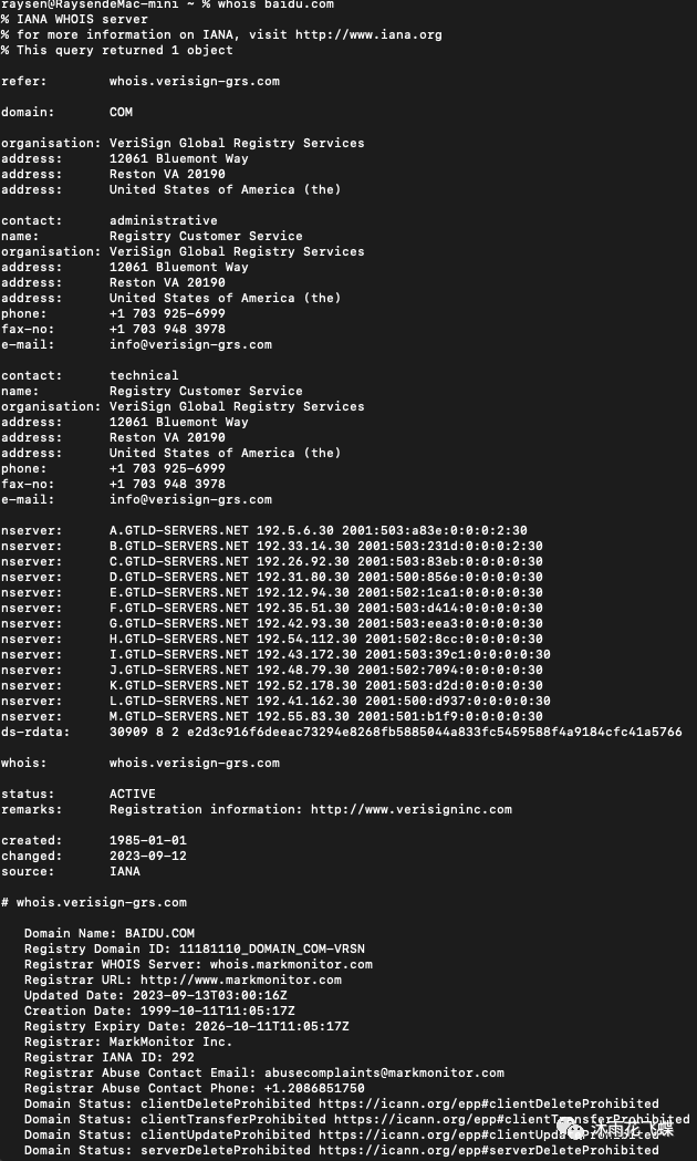 nslookup:用于查询域名的IP地址和其他DNS记录。例如,要查询域名baidu.com的IP地址,可以在命令行中输入nslookup baidu.com。图片
