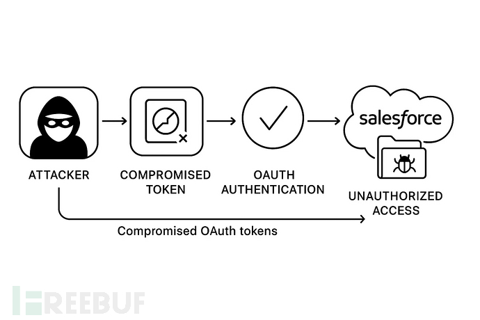 OAuth令牌作为数字密钥,允许应用无需密码验证即可跨平台访问用户数据。在Drift案例中,这些令牌使聊天机器人平台能与Salesforce、Google Workspace等业务系统集成。通过窃取令牌,UNC6395获得了同等信任权限,绕过了传统安全控制。