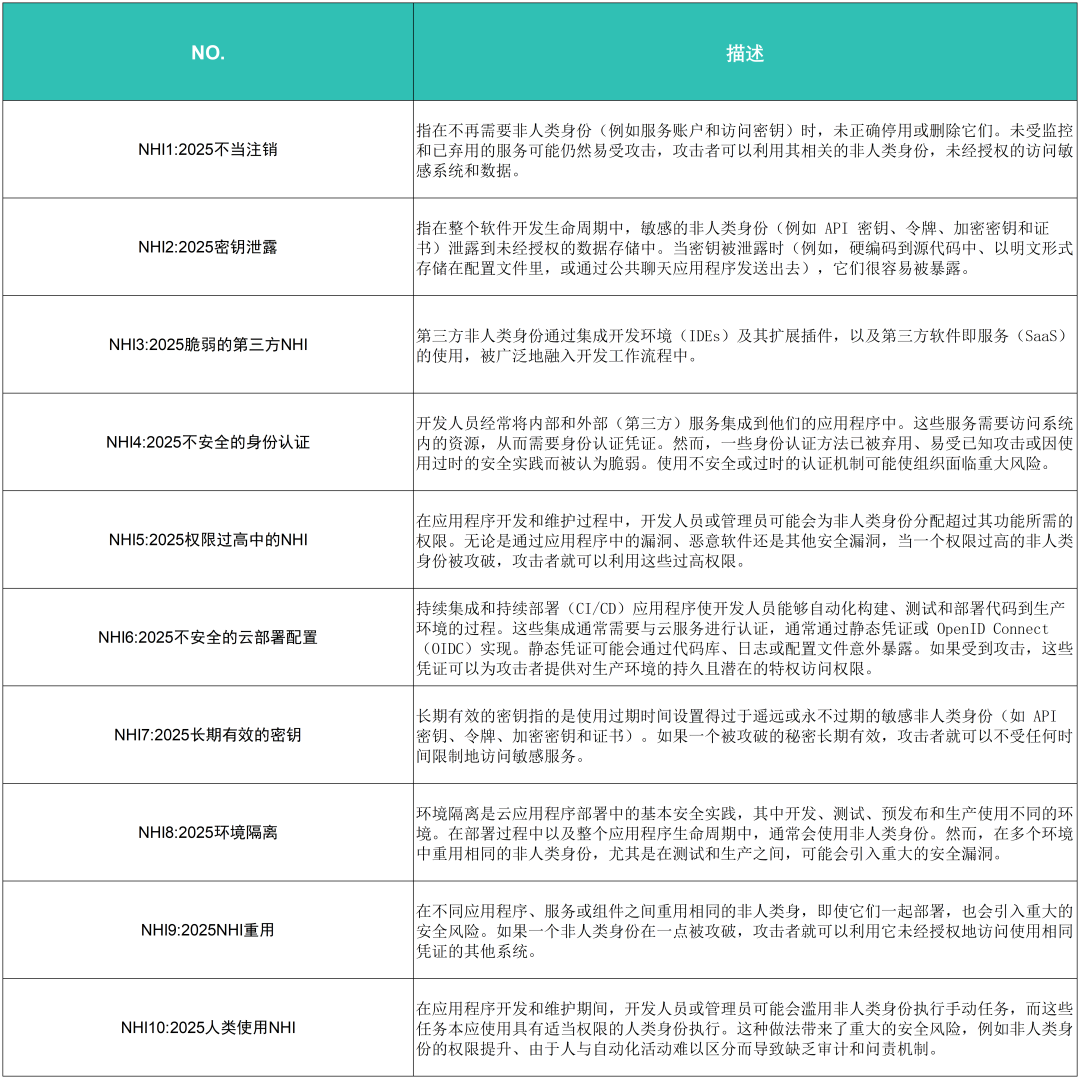 (二)NHI的快速增长带来了广阔且常被忽视的攻击面随着自动化系统、应用程序和基于云的基础设施的广泛应用,非人类数字身份(如服务账户、API 密钥和机器凭证)的快速增长带来了广阔且常被忽视的攻击面。受益于移动通信、云计算、物联网、API经济、AI Agent、机器人等多方面因素并发影响,NHI近年呈突发性增长态势。其中,云计算、物联网技术的普及是NHI爆炸性增长的主要驱动力。据Gartner等多家调研数据显示:非人类身份数量将是人类身份的10~50倍,而云环境中95%的身份都是非人类身份。微软2024年的Midnight Blizzard数据泄露事件、互联网档案馆2024年的Zendesk支持平台数据泄露事件,以及2023年的Okta支持系统数据泄露事件,均与非人类身份安全漏洞相关。OWASP在2025年也首次发布了非人类身份(NHI)安全十大风险清单,为企业和组织在非人类身份安全管理方面提供了重要的参考依据。