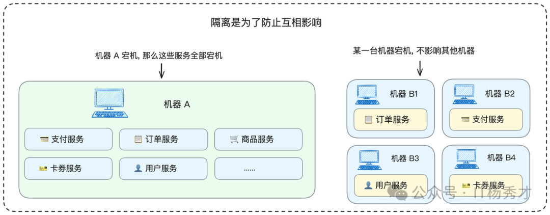道理很简单,如果所有核心服务都运行在同一台物理机上,一旦这台机器宕机,整个核心业务链条将瞬间瘫痪。反之,如果它们被部署在不同的机器上,单一节点的故障只会影响该节点承载的服务,其他核心服务依然安然无恙,系统的“抗打击能力”自然更强。