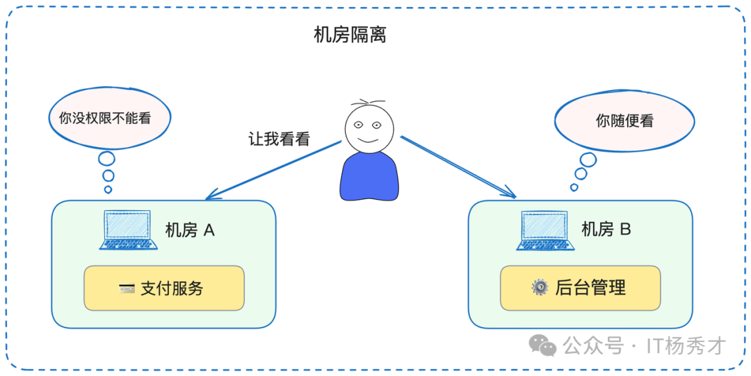 机房隔离,顾名思义,就是将核心业务部署在独立的物理机房中,不与非核心业务混合。这种隔离级别最高,通常伴随着更严格的变更审批流程、运维管理制度和访问权限控制,因此安全性也最高。