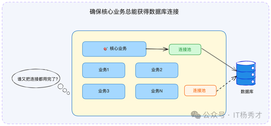 这两种隔离方式可以归为一类——“池化资源隔离”。它们针对的是同一个服务进程内部的资源管理。无论是数据库连接池还是线程池,核心思想都是为关键业务或核心模块预留专用的资源池。