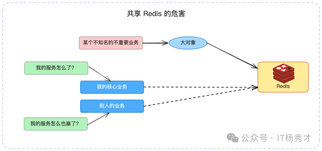我们经常在技术社区看到这样的故障复盘:某公司因为多个业务线共用一个Redis集群,结果一个次要业务的异常操作(如写入大Key)导致Redis性能骤降甚至崩溃,进而引发所有依赖该Redis的核心业务全部瘫痪。