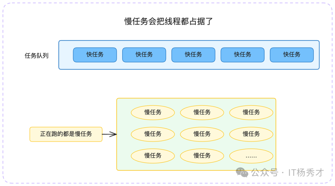 举个例子,假设线程池大小为100,大部分任务都能在1秒内完成。但如果某一时刻,突然涌入了100个执行时间长达1分钟的慢任务,它们会瞬间占满所有线程。此时,后续到来的所有快任务都只能在队列中排队等待,无法得到及时处理,导致系统响应延迟急剧增加。