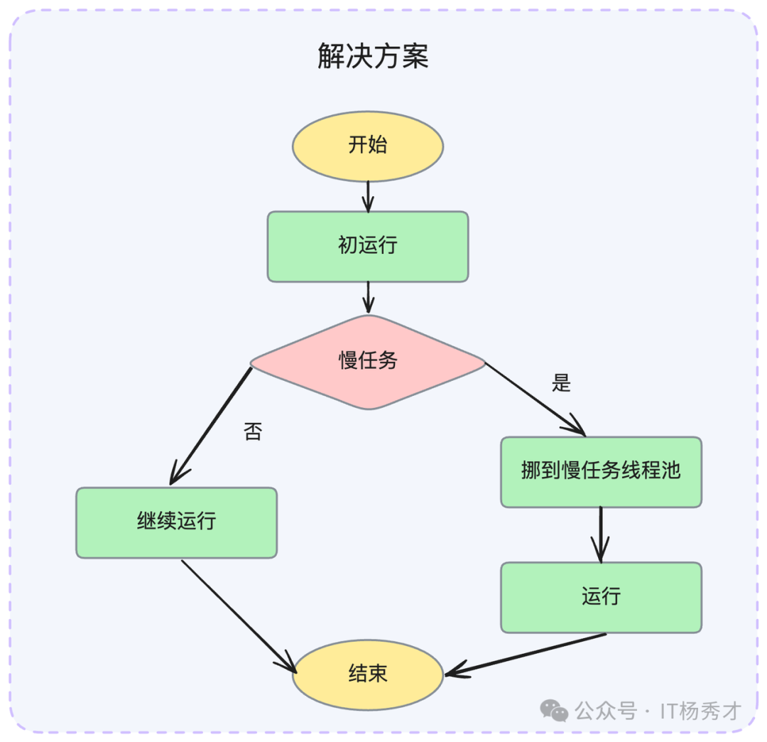 核心思路是创建两个线程池:一个‘快速通道’,一个‘慢速通道’。当一个新任务到来时,它首先进入快速通道的线程池开始执行。在执行的初始阶段,我们会有一个快速的‘甄别’逻辑,来判断它属于快任务还是慢任务。如果是快任务,就继续在快速通道执行完毕;如果识别出是慢任务,则会将其‘转移’到慢速通道的专属线程池中执行,从而释放出快速通道的资源。”