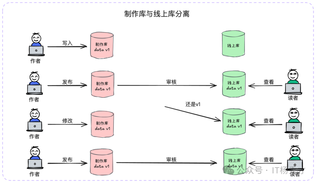 可用性:B端(作者端)对制作库的频繁写操作,甚至制作库的短暂抖动,都不会影响到C端(读者端)的读取体验,因为C端访问的是稳定、独立的线上库。性能:C端的线上库绝大部分都是读流量,几乎没有写操作。这使得数据库的性能非常稳定,并且可以进行极致的缓存优化。例如,在内容发布同步到线上库的同时,就可以直接将最终数据写入缓存。后续的阅读请求将直接命中缓存,实现毫秒级响应,甚至无需查询数据库。