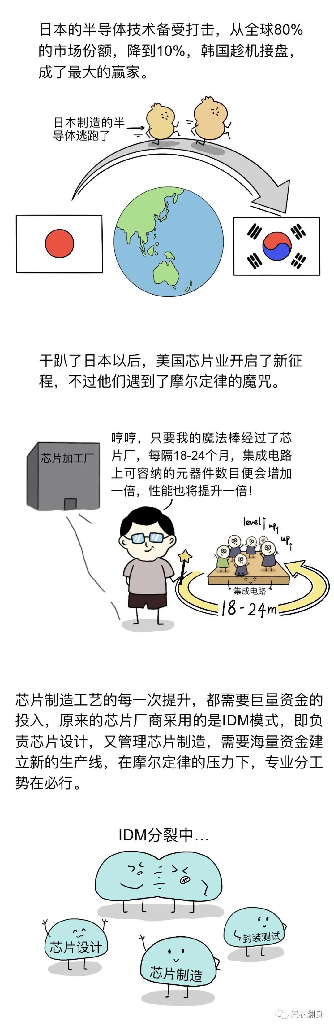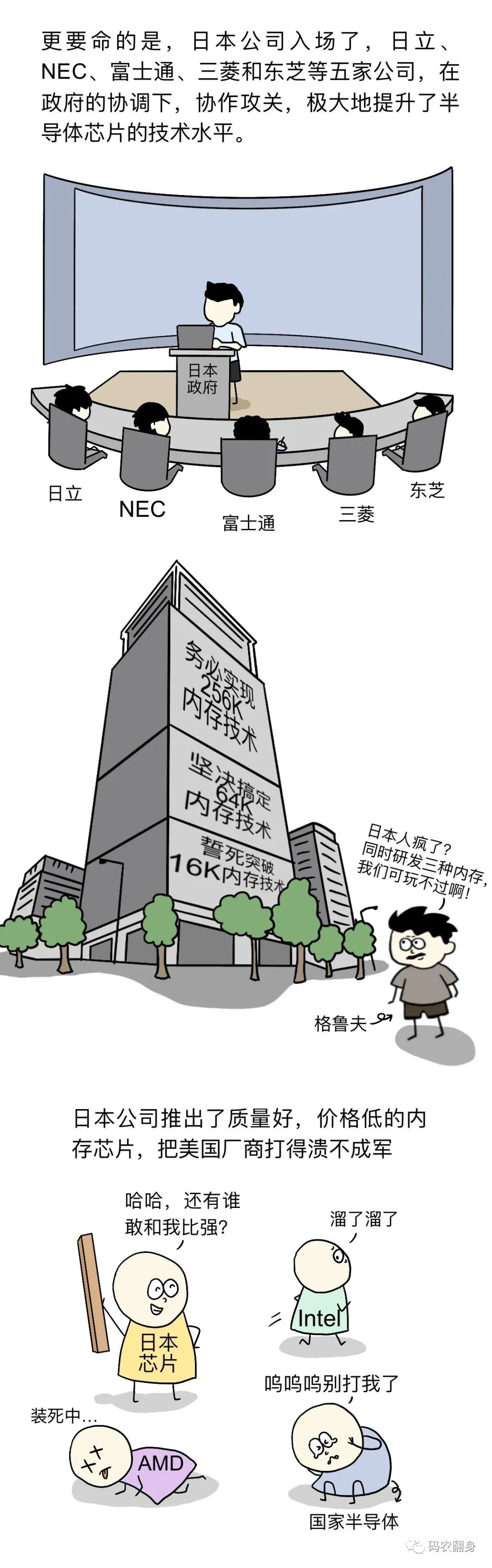 芯片行业战争是技术路线之争,技术路线涵盖广泛,包括材料、工艺、结构、设备等,任何一个选择错误,都会给企业带来灭顶之灾。而行业的特点又决定了,每隔18-24个月,芯片企业的决策者们都要像拆弹专家一样,面临剪红线还是剪蓝线的抉择;芯片行业战争也是经济体制之争。美国的自由经济早期起了重要作用,后期东亚国家有政府参与的经济行为表现出来的组织性与战斗力,让美国芯片企业吃了大亏; 芯片行业战争更是是综合国力之争。芯片产业代表了当前人类科技的最高水平,也是人类社会重要的基础设施。芯片技术的产生与发展源自国家的科技、经济与社会积累,芯片企业的发展壮大离不开政府的保驾护航。