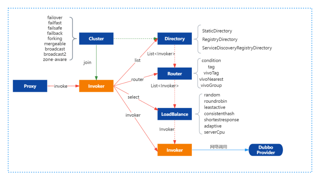 客户端通过本地代理Proxy调用ClusterInvoker,ClusterInvoker从服务目录Directory获取服务列表后经过路由链获取新的服务列表、负载均衡从路由后的服务列表中根据不同的负载均衡策略选取一个远端Invoker后再发起远程RPC调用。