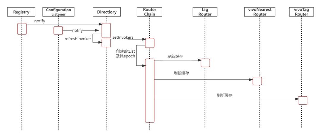 当注册中心或者动态配置有变更时,相关通知会给到服务目录Directory,Directory收到通知后会重新创建服务列表,并把服务列表同步到路由链RouterChain,RouterChain再按顺序通知其链上的Router,各个Router再进行缓存清除并重新进行路由结果的计算及进行缓存。相关时序图如下所示: