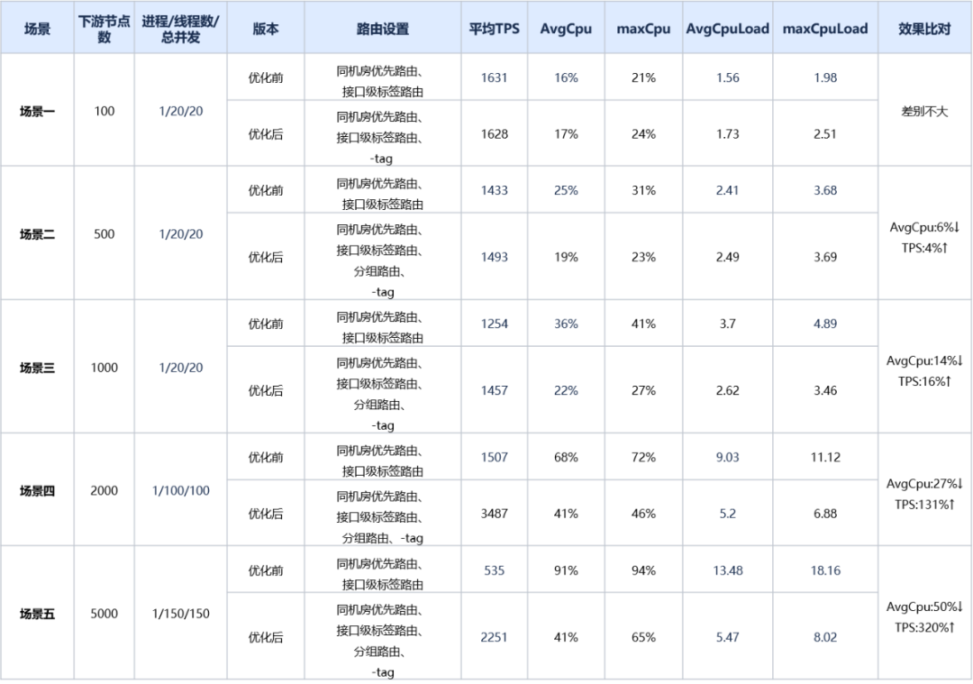 针对优化前和优化后,我们编写Demo工程分别压测了不配置路由/配置就近+标签路由场景。Provider节点梯度设置100/500/1000/2000/5000,TPS在1000左右,记录了主机的cpu等性能指标,并打印火焰图。发现,配置路由后,采用相同并发,优化后的版本tps明显高于优化前版本,且新版本相较于没有配置路由时tps显著提高,下游节点数大于2000时,tps提升达到100%以上,下游节点数越多,AvgCpu优化效果越明显,并且路由及负载均衡CPU占比明显更低,详细数据可见下表: