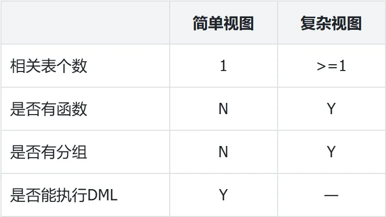 提供额外数据访问安全,通过对用户设置视图访问权限,约束用户访问指定的行或列。隐藏数据复杂性,例如视图可将由多个表组成的查询封装为新的数据集,屏蔽其内部复杂性。简化用户的SQL语句,复杂内部逻辑通过视图来封装。隔离应用与数据表,可让应用不受表定义变更的影响进而可封装基表数据展现,使得应用程序与数据库表在一定程度上独立。2).视图分类