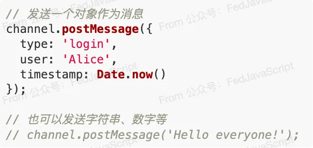 2. 发送消息创建实例后,使用 postMessage() 方法向频道广播消息。所有监听该频道的其他标签页都会收到此消息。
