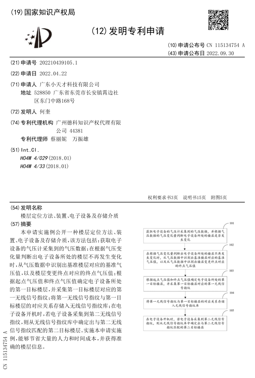 这份名为“基于气压计楼层定位方法、装置及智能手表”的创新专利(专利号:202210439105 .1)由广东小天才科技有限公司提交于2022年4月。其中明确指出——