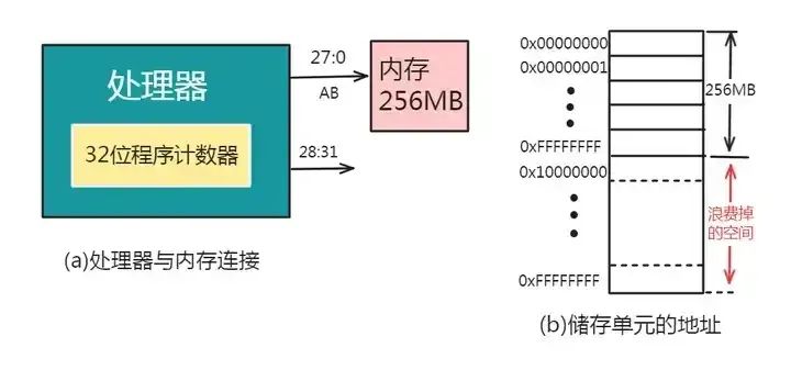 但遗憾的是,实际上计算机所配置内存的实际空间常常小于处理器的寻址范围,这是就会因处理器的一部分寻址空间没有对应的物理存储单元,从而导致处理器寻址能力的浪费。例如:如下图的系统中,具有32位寻址能力的处理器只配置了256M的内存储器,这就会造成大量的浪费: