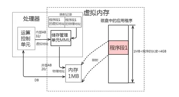 从处理器运算装置和程序设计人员的角度来看,它面对的是一个用MMU、映射记录表和物理内存封装起来的一个虚拟内存空间,这个存储空间的大小取决于处理器程序计数器的寻址空间。