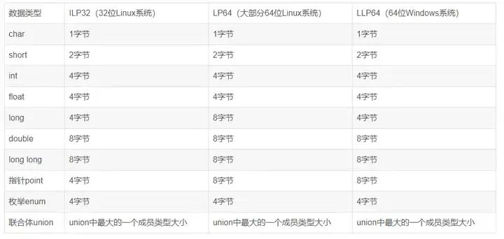 基本变量类型所占大小如下图,不同的系统的区别在于long和point类型的大小: