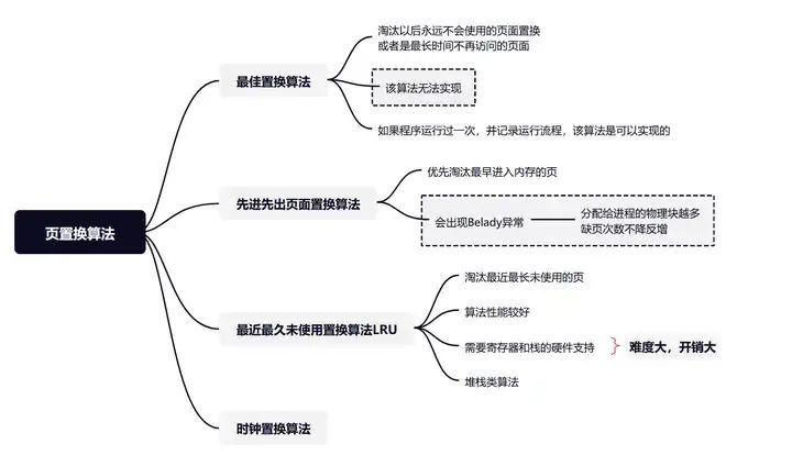 当物理内存已满,而又需要加载新的页面时,操作系统就需要决定将哪个页面从内存中置换出去,这就用到了页面置换算法 。页面置换算法的目标是尽可能减少缺页中断的次数,提高系统性能。