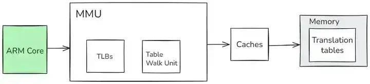 每个TLB entry通常不仅包含物理地址和虚拟地址,还包含诸如内存类型、缓存策略、访问权限、地址空间ID(ASID)和虚拟机ID(VMID)等属性。如果TLB不包含处理器发出的虚拟地址的有效转换,称为TLB Miss,则将执行外部转换页表查找。MMU内的专用硬件使它能够读取内存中的转换表。