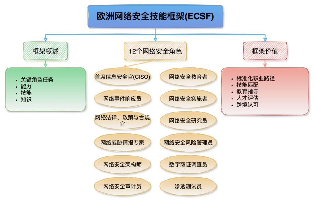 ECSF框架以以角色为中心,将网络安全专业人员的职责细化为12个网络安全典型专业角色,并为每个角色提供了详细的描述和所需的能力、技能、知识,旨在促进人才市场对网络安全人才需求的理解。