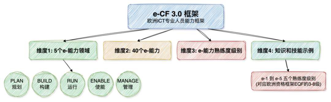 e-CF3.0框架基于其“四个维度”来构建ICT能力,宏观职能划分为5个e-能力领域、定义了40个e-能力、以及从e-1到e-5的五个熟练度级别,提供了在整个欧洲范围内对能力水平进行一致解释的参考。