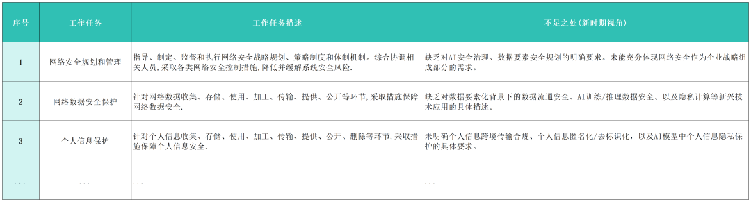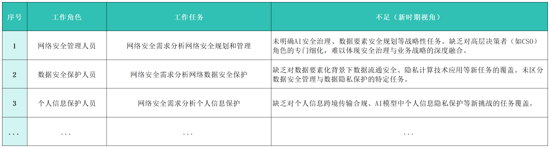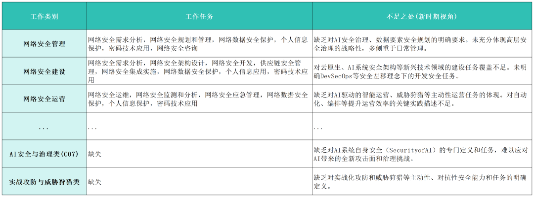 在工作类别方面的不足主要体现在:一是宏观分类与新战略脱节。国标将工作类别划分为5类(管理、建设、运营、审计评估、科研教育),未能充分体现AI安全与治理、数据安全与隐私保护(特别是数据要素化背景)、实战攻防与威胁狩猎等具有战略意义和独立性的新兴领域。二是任务范围未及时拓展。在每个工作类别下,宏观任务定义未能涵盖如AI伦理与治理政策制定、AI系统安全架构设计、云原生安全建设、威胁狩猎实践等新时期涌现的关键工作。