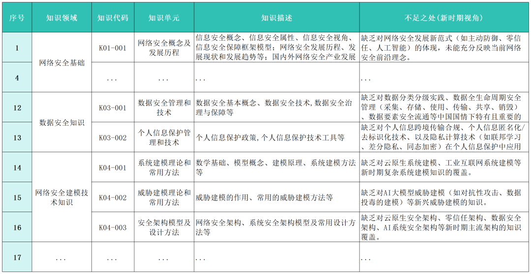 在知识体系方面的不足主要体现在:一是新兴技术知识覆盖不足。一是在AI安全(如对抗性机器学习原理、大模型安全)、隐私计算相关密码技术(如同态加密、后量子密码)、云原生安全原理、DevSecOps流程等新时期关键知识点上,缺乏足够的深度和明确的知识单元。二是实战化知识体现不足。缺乏对实战化攻防理论、安全体系韧性理论、威胁狩猎方法论等实战对抗相关知识的描述。