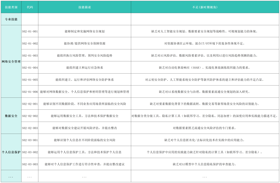 在工作任务描述方面的不足主要体现在:一是新兴技术任务缺失。20项主要工作任务中,缺乏针对AI模型安全评估与加固、大模型应用安全开发与测试、隐私计算技术实施等AI和数据安全核心任务的明确描述。二是实战化任务强调不足。对于网络安全测试、应急管理等任务的描述,未能充分体现高强度红蓝对抗演练、APT攻击溯源与归因、0day漏洞挖掘与利用等实战化要求。三是欠缺深度和前瞻性。工作任务描述较为通用,缺乏对AI驱动的智能安全、数据要素安全流通等前沿理念的深入阐述。