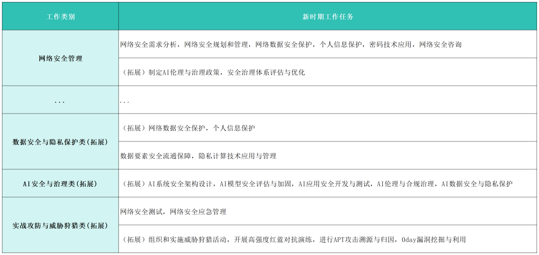 新时期网络安全人才能力框架在GB/T42446-20235个5大工作类别基础上,进行了强化和拓展,一是强化已有工作类别的工作任务,二是新增拓展了数据安全与隐私保护类、AI安全与治理类、实战攻防与威胁狩猎类等3个核心类别。新框架可以更全面地覆盖新时期网络安全人才能力的广度和专业化需求,以适应更加复杂和专业化的安全需求,体现了新时期的战略重点。