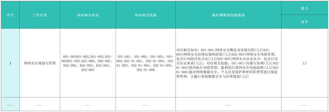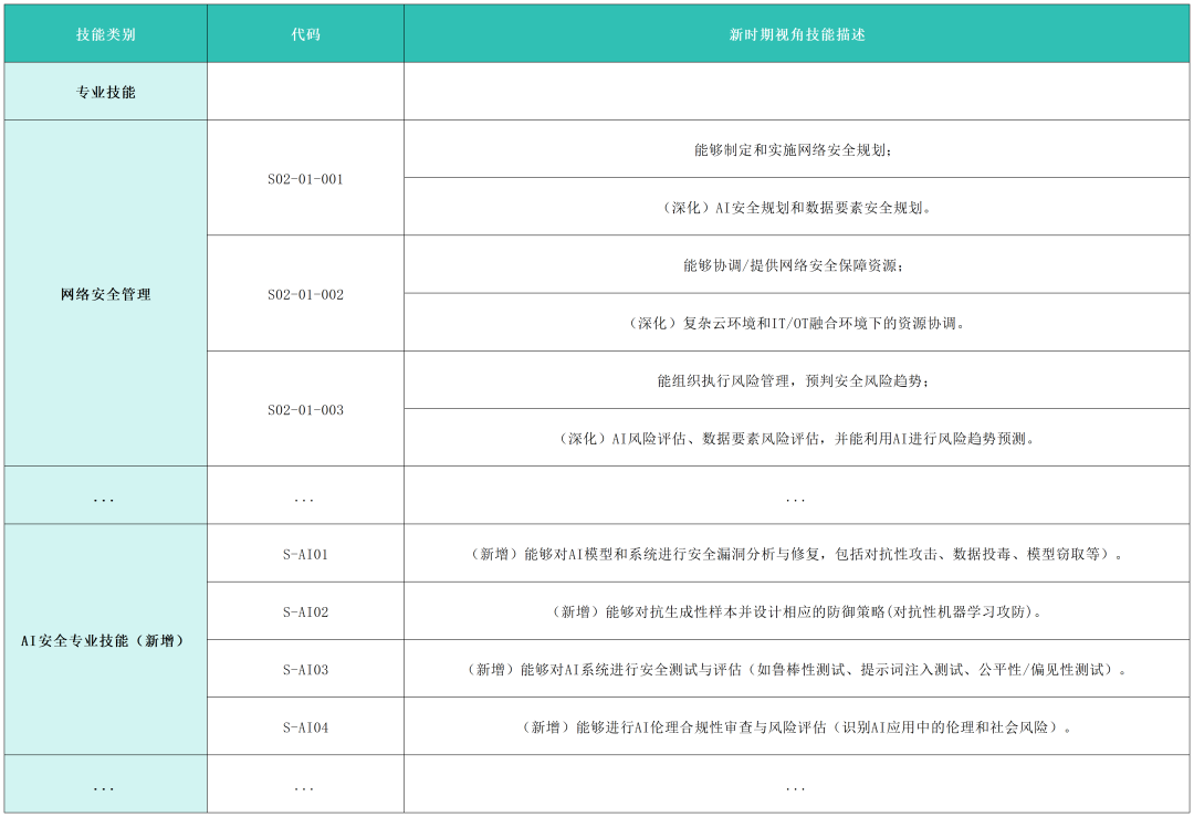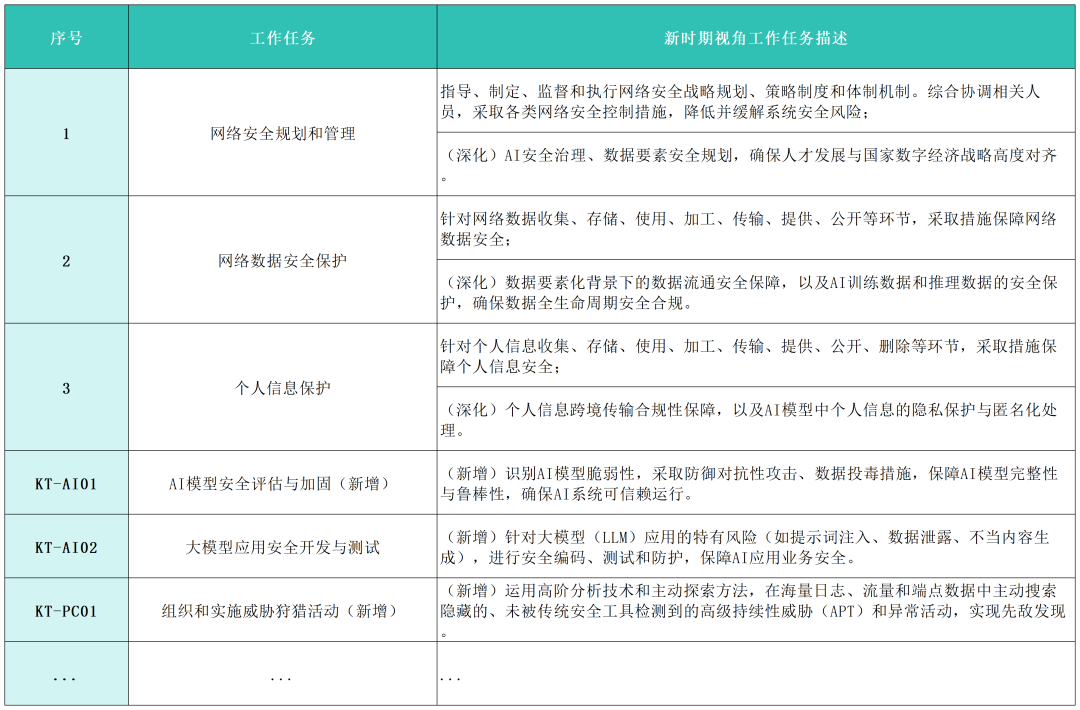 新时期网络安全人才能力框架在GB/T42446-2023的20项任务基础上,深化了已有的20个任务,并新增了识别AI模型脆弱性、大模型应用风险管理、威胁狩猎、实战攻防、高级威胁防御、漏洞挖掘、数据要素安全、数据流通技术等8个任务,制定更贴近新时期的实际工作内容,为人才培养和能力评估提供具体指引。