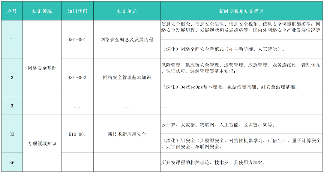 新时期网络安全人才能力框架在GB/T42446-2023的10个知识领域基础上,参考并融合国标知识领域与新时期拓展,深化框架的新兴技术内容,确保知识体系能够覆盖前沿技术。