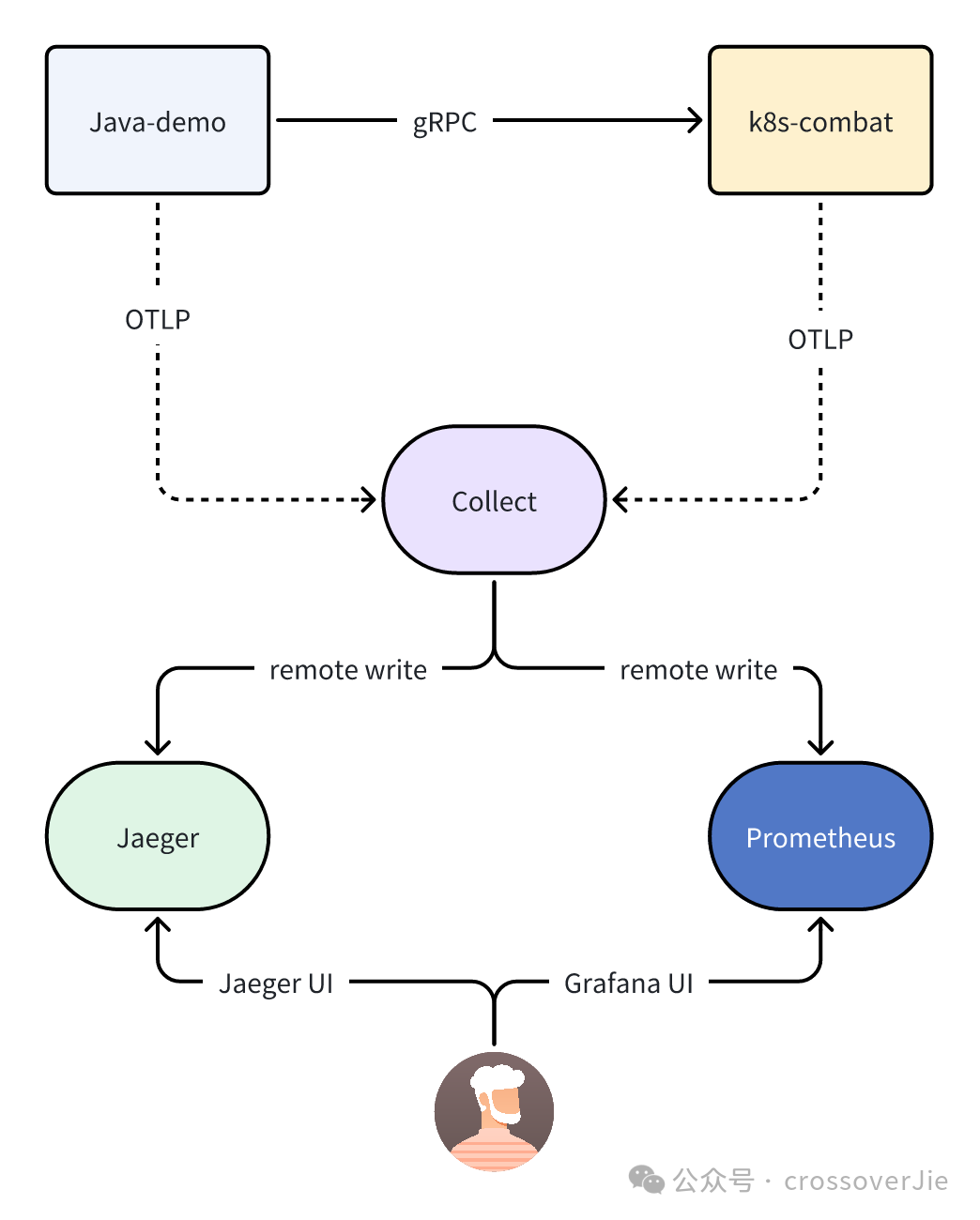 不再由 Prometheus 主动抓取应用指标,而是由应用给 OpenTelemetry-Collector 推送标准化的可观测数据(包含日志、trace、指标),再由它远程写入 Prometheus 这类时序数据库中。