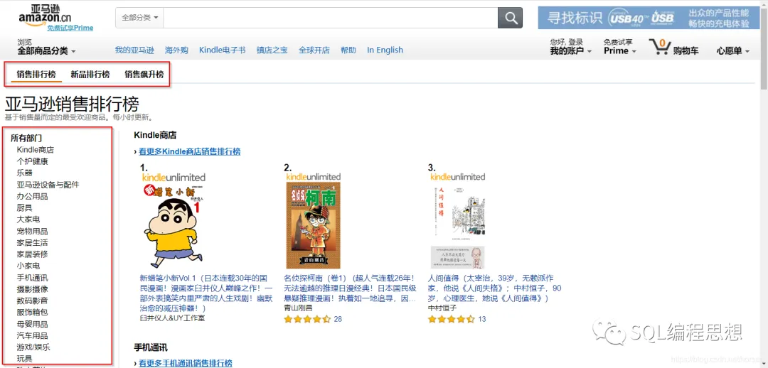 不知道你有没有注意过,在亚马逊或者京东等电商平台的网站上都提供了准实时的产品分类销售排行榜。例如,以下就是亚马逊上销售排行榜和销售飙升榜的一个截图: